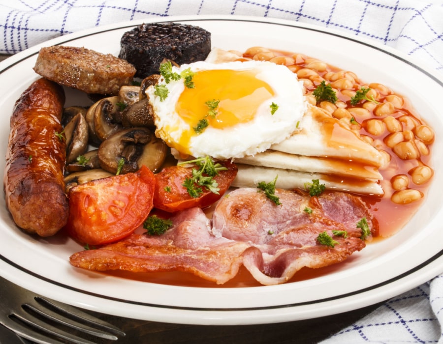 This is a traditional Irish breakfast that usually consists of bacon, sausages or bangers, eggs, beans, tomatoes, mushrooms, and toast.